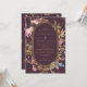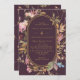 Um convite de casamento estilo boho rico perfeito para o outono, com flores silvestres de cor d'água mauve e folhas em volta de uma moldura de forma dourada, sobre um fundo de ameixa/beringela escuro. O reverso apresenta um padrão de flores silvestres de aquarela em um fundo de beringela escuro.