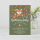 Convide os hóspedes para a festa de aniversário do seu filho com este encantador convite para a floresta, com uma adorável raposa desenhada à mão sentada entre as ferramentas, as rochas da mosca, as bolotas e as coloridas folhas do outono. A festa de aniversário é escrita em um script de pincel branco. O fundo é uma textura verde quente de mossy.