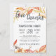 Convite jante russo e simples de Ação de Graças, com uma escrita elegante e escrita escura e uma tipografia moderna num fundo branco com um toque na moda de bonito abóbora de aquarela e ouro chic e folhagem de outono de cobre. A parte traseira da placa tem uma cor laranja de cobre. Basta adicionar seu nome de família, data e local. Desenvolvido exclusivamente para você pelo Happy Dolphin Studio. Se precisar de ajuda ou produtos correspondentes, entre em contato conosco em happydolphinstudio@outlook.com. Estamos felizes em ajudá-lo a organizar a mais maravilhosa festa do janto de Ação de Graças!