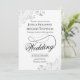 This beautiful wedding invitation features an elegant silver and white design with ornate faux foil curls and swirls in the corners. The word "wedding" is written in fancy script lettering with an elaborate flourish on the end of the word. Simple, stylish, posh, and glam, this invitation is sure to make a lasting impression, and is a wonderful way to invite your family and friends to share in your joy on your special day.