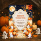 Convide pequenos boos para uma noite de fantasias e doces! Este convite para festas de Halloween, crianças fofinhas e fofinhas, mostra fantasmas sorridentes, abóboras empilhadas, folhas de outono em queda, e uma lua de cheio brilhando em um céu estrelado. O aspecto de aquarela suave mantém-no divertido para as crianças — festivas, não assustadoras. Perfeito para cacos de bairro, festas em sala de aula, malas ou guloseimas, ou aniversário de outubro com um tema de fantasia. Trabalha para rapazes ou raparigas; excelente para irmãos e grupos. Design com fantasmas e abóboras.