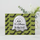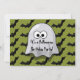 Os bastões pretos do vôo com olhos que de incandescência o fundo contra o verde da queda é perfeito para estes aniversário do Dia das Bruxas convidam. Em letras assustadores, lê-o é uma festa de aniversário do Dia das Bruxas na parte dianteira contra um fantasma bonito do miúdo com os olhos grandes de google. A parte traseira tem o fundo de harmonização da verde azeitona com rotulação de harmonização para a informação da festa de aniversário do Dia das Bruxas da sua criança personalizada.