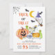 Convite de aniversário de Halloween que você pode personalizar para qualquer idade. Design de aquarela com um fantasma giro, felicidade ou abóbora-lanterna, poções mágicas, morcegos, aranhas e teias de aranha. "Trick or Tratat" está escrito em uma tipografia mimada de cobweb e você pode personalizar o texto restante. Um divertido temático do halloween convida para a sua festa de aniversário.