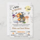 Este convite para chás de fraldas apresenta um tema do Dia das Bruxas com um fantasma alegre num chapéu de bruxa roxo, segurando uma cesta de abóbora. Um gato preto piscando senta-se num caldeirão, ao lado de uma garrafa de bebê, abóboras e balões. Os morcegos voam contra uma lua de cheio, com teias de sopa e galhos assustadores molhando o design.