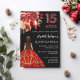 Um convite moderno, na moda e glamouroso para uma Quinceañera, festa de aniversário 15. Um fundo preto, uma menina vestindo um vestido vermelho e dourado, arco vermelho, vermelho e rosa e rosas ouros, florais. O nome é escrito com um moderno estilo escrito à mão. Personalize e adicione os detalhes da sua festa.