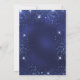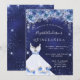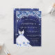 Um convite moderno, na moda e glamouroso para uma Quinceañera, festa de aniversário 15. Um fundo azul da meia-noite com poeira suja, um vestido e flores azuis. A cor azul é irregular. O nome é escrito com um moderno estilo escrito à mão. Personalize e adicione os detalhes da sua festa.