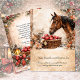 This elegant Christmas card features a serene winter farmhouse scene centered around a gentle brown horse gazing at a basket of bright red apples dusted with snow. Soft snowfall drifts across a warm, neutral background, while autumn leaves and subtle seasonal textures add depth and rustic charm. Below the illustration, graceful script lettering shares a heartfelt holiday message, creating a peaceful and inviting design. Perfect for those who love country Christmas décor, equestrian art, and timeless seasonal beauty, this card conveys warmth, simplicity, and classic holiday joy. The back of the card is another vintage scene with a lantern and red cardinal. Personalize with your own information.
