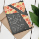 Convide amigos para a festa de pizza do seu filho com estes convites bonitos. Design apresenta os detalhes da sua festa rodeados por fatias coloridas de pizza de pepperoni com cor d'água em um fundo chalkboard rústico. Adicione os detalhes da sua parte usando os campos modelo fornecidos.