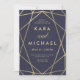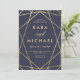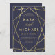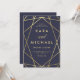 Estes elegantes convites de casamento glam têm um fundo azul marinho e um design geométrico moderno de ouro falso.