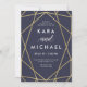 Estes elegantes convites de casamento glam têm um fundo azul da meia-noite e um design geométrico moderno de ouro falso. Todo o seu texto está em branco.