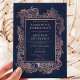 Uma elegante ilustração floral falso rosa em ouro, desenhada por uma mão moderna, sobre a cor azul marinho chic e elegante, com convite para casamento. Perfeito para um casamento elegante.