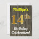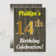 Este design convite de aniversário apresenta uma mensagem como "Phillipe's 14 Birthday Celebration!", onde o nome pode ser personalizado, e onde o número "14" tem uma aparência falsa de ouro. Ele também apresenta um fundo de aparência rústica de madeira falsa. Os detalhes do evento no verso podem ser personalizados. Poderia ser usado para convidar pessoas para a festa ou festa de aniversário de alguém do décimo quarto aniversário. [~Z0000119]