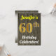 Este design convite de aniversário apresenta uma mensagem como "60ª Celebração de Aniversário de Jennifer!", onde o nome pode ser personalizado, e onde o número "60º" tem uma aparência falsa de ouro. Ele também apresenta uma aparência rústica de madeira falsa. Os detalhes do evento no verso podem ser personalizados. Poderia ser usado para convidar pessoas para a festa de sexagésimo aniversário ou festa de aniversário de alguém. [~Z0000119]