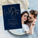 Fazemos Casamento Azul De Marinho De Foto Dourado. Um design simples, mas elegante, com tipografia dourada sobre um fundo azul marinho clássico. Script do conjunto de na moda: Nós levamos o palco central no topo. O resto do texto que você pode personalizar facilmente. As cores de texto e de fundo podem ser alteradas se você quiser se adequar melhor ao seu tema de casamento através da opção personalizar mais. Substitua a imagem de exemplo no verso por sua.