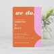 O nosso convite para o casamento, ao estilo retrógrado, é perfeito para o casal da moda, que ama se destacar e fazer uma declaração ousada. Nosso design apresenta uma combinação de cor rosa brilhante e laranja. Formas simples de abstrato e círculos criam uma aparência em negrito com "Fazemos." exibidas ousadamente em letras grandes brancas. O verso apresenta um simples design moderno, com um monograma ousado e um endereço opcional do site de casamento do casal. Projetado por Papelaria de Moodthologia