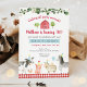 Este belo convite de aniversário mostra animais de fazenda aquosos com acentos florais verdes, confetti e uma borda vermelha de gingham.