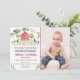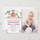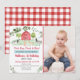 Este belo convite de aniversário mostra animais de fazenda aquosos com acentos florais verdes, confetti e uma borda vermelha de gingham.