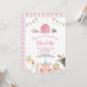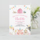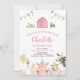 Um convite de aniversário de celeiro rosa e animais da fazenda para a festa de aniversário com tema de quintal da sua menininha.