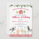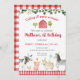 Este belo convite de aniversário mostra animais de fazenda aquosos com acentos florais verdes, confetti e uma borda vermelha de gingham.