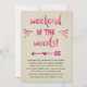Este convite rústico para uma festa de solteira de "glamping" em uma cabine apresenta uma bonito caligrafia com roteiro de pincel que diz "Fim de semana na floresta!" com um efeito de aquarela rosa. O design também inclui um coração e uma seta, florescimentos bonito e um fundo de textura de madeira.