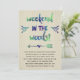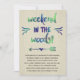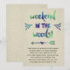 Este convite rústico para uma festa de solteira de "glamping" em uma cabine apresenta uma bonito caligrafia com roteiro de pincel que diz "Fim de semana na floresta!" com um efeito de aquarela verde, azul e roxo. O design também inclui um coração e uma seta, florescimentos bonito e um fundo de textura de madeira.