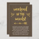 Este belo e rústico convite para uma festa de solteira de "glamping" em uma cabine apresenta uma bonito caligrafia de pincel que diz "Fim de semana na floresta!" A design inclui também um coração e uma seta, florescimento bonito, brilho sujo de ouro e fundo de textura de madeira.