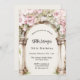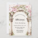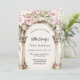 Um grande arco de mármore decorado com flores cor-de-rosa. Personalize e adicione um nome e detalhes da parte.