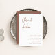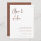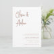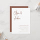 Um belo convite de casamento baseado em tipografia, com os seus nomes em letras modernas de terracotta rust, escrita à mão no topo. Personalize com seus detalhes de casamento em letras clássicas de serif alinhadas no canto inferior direito.