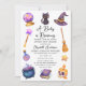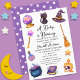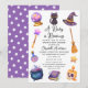 Feiticeira Cuta Um Bebê está criando o Chá de fraldas de Halloween, apresenta ilustrações bonitinhas de aquarela de um gato, livro, vassoura, varinha, caldeirão, chapéu de bruxa, garrafa de poção, bola de cristal e crânio dispostos em um quadro. O verso apresenta um padrão de estrelas brancas sobre um fundo roxo. Correspondência de Itens em nosso compro para um tema completo de festa.