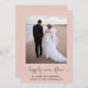 Elegante e sofisticado anúncio de casamento ou elopamento cor de rosa para casamentos menores e convite para recepção ou festa pós-casamento. A frente apresenta sua fotografia, "feliz para sempre" em um script estiloso com floreios e seus primeiros nomes, data e local do casamento. No verso, você pode personalizar seu anúncio de casamento com mais detalhes, adicionar um convite para recepção ou festa e assinar seus nomes de casados em uma fonte com estilo de assinatura.