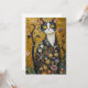 Esta imagem apresenta um gato espantoso renderizado no estilo artístico que lembra Gustav Klimt. O gato, com os olhos amarelos gritantes, o pelo branco e preto, e padrões intrincados e giratórios em seu corpo, expele uma aura regal e misteriosa. O fundo é ricamente detalhado com matizes ouros, formas orgânicas e motivos florais, misturando-se perfeitamente à figura do gato, que é adornada com padrões circulares ornamentados e delicados embelezamentos. O efeito geral é uma fusão mesmerizante de beleza natural e design decorativa luxuosa.