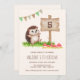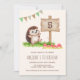 Convites de aniversário para crianças adoráveis, com um belo ouriço alegre, grama verde e cogumelo colorido no chão, bandeira de festa e um conselho de madeira com o número.