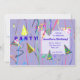 Um convite de aniversário com o meu design de chapéus e agitadores de partido num fundo roxo.