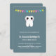 Convite de aniversário com um desenho de um dente branco grande com um sorriso kawaii fofo e grandes olhos felizes.