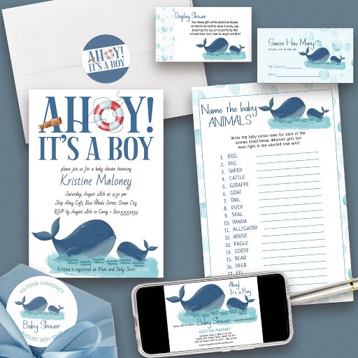 Feliz convite ao chá de fraldas de baleias. Esta design de aquarela fofa é feita com "Ahoy! É um menino" e apresenta uma mamãe e uma baleia bebê nadando no mar com um quadro de bolhas oceânicas. O texto do convite é escrito em tipografia química e é totalmente editável. Um tema popular para um chá de fraldas de menino com uma paleta colorida em tons de azul profundo, aqua e verde oceânico.