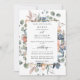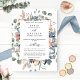 Aprecie seus hóspedes com este brilhante convite botânico floral, com um belo buquê de cor aquosa pintado à mão em uma bela folhagem verde e pequenos detalhes florais em uma mistura de pincéis, pêssego, marfim, coral macio, azul empoeirado e tons azuis. Sobreponha a seção elegante com seus detalhes encapsulados pelo quadro do ouro. Elementos de caligrafia modernos. O cartão está de volta em elegante sombra azul empoeirado. Parte da nossa coleção de Casamentos e eventos "Feliz Floral".