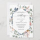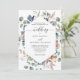 Aprecie seus convidados com este elegante convite floral de aquarela. Convite mostrando seus detalhes de casamento em uma estrutura geométrica cercada por delicada folhagem de cor d'água pintada com a mão e detalhes de flores delicadas em uma combinação graciosa de pincel, rosa pincel, marfim, rosa empoeirado, azul empoeirado e tons de sábio. Traseira de cartas num tom azul elegante e empoeirado. Parte da nossa coleção de casamento e eventos "Feliz Floral".