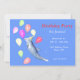 Aniversário convida com minha trabalho de arte de um golfinho alegre vestindo um partido cercado por balões.