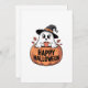 Feliz convite para o Halloween Caffeine Ghost. Dentro uma abóbora gigante, um fantasma dá um café debaixo do seu chapéu de bruxa torto. Boo-hoo? Mais como o brew-hoo! ele ri, o bigode de espuma brilhando. Feliz Halloween, amigos cafeeiros ficam assustados e acordados!