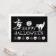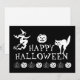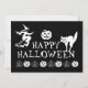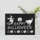 Feliz convite de Halloween, cartão de saudação O design apresenta jack ou lanterna, abóbora, bruxa, crânio, lua, gato preto. Texto branco e gráficos em fundo preto.