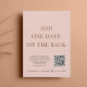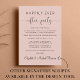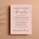 Na moda pincelada cor-de-rosa ou anúncio privado de casamento e convite de recepção. Na frente, "Felizmente, nunca depois da festa" é escrito em uma mistura de simples tipografia e um roteiro elegante com supressões, e você pode personalizar sua mensagem e convite e adicionar seus nomes em um roteiro semelhante a assinatura. No verso, insira o endereço de URL do seu site de casamento para criar um Código QR para os convidados pesquisarem todos os detalhes e para RSVP on-line.