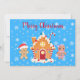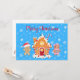 Desejamos-lhe um excelente de férias! Um convite de pão de Natal feliz para a sua festa de Natal, decorado com uma casa de pão de gengibre e biscoitos. Flocos de neve brancos num pano de fundo azul, um casal de pão de gengibre, uma casa de pão de gengibre cheia de doces, canetas doces e decorações de Natal.