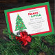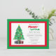 Feliz chá de fraldas de Natal. O convite apresenta o tema de feriado vermelho e verde com flocos de neve de cinza, árvore de Natal e presentes.