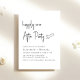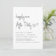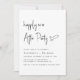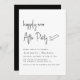 Convite minimalista de recepção de casamento preto e branco com a apresentação de "Feliz Sempre Depois da Festa" em uma escrita moderna de chic, seus detalhes em letras simples e seus nomes em tipografia serif clássica.