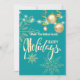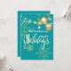 Felizes festas flocos de neve dourados e enfeites de Natal, flocos de neve, luzes de corda, cartão de convite verde de feriado moderno e elegante.