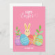 Ilustração de desenho animado de um coelho fofo da Páscoa e ovos em um cartão cor-de-fundo rosa. É maravilhoso saudar amigos e família para o feriado da Páscoa. Você poderia personalizar todo o texto.