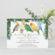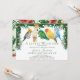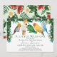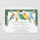 Celebre a chegada iminente do seu pequeno selvagem com este convite de chuveiro de bebê temático tropical caprichoso. O design apresenta um grupo de adoráveis papagaios exóticos e folhagens tropicais em aquarela com flores