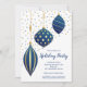 Os ornamentos das árvores de Natal azuis e douradas escuras e os pontos azuis e dourados com os detalhes da sua festa de Natal nas letras quic são apresentados nestes convites de férias INSTANTÂNEOS ou IMPRESSOS. Perfeito para a festa de férias do seu escritório, festa de Natal, convite de festas de janto de férias e muito mais. CORRESPONDENTE a itens na nossa coleção.