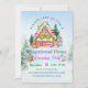 Um convite para poster do tamanho de uma casa de gengibre decorando uma festa com um biscoito, doces e design de neve de inverno.