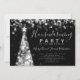O design elegante do convite de festas do Housewarming do feriado com a árvore de Natal de prata ilumina o motivo, nome e data feita sob encomenda e texto adicional